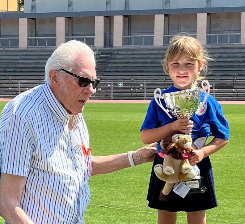 «Una grande festa dello sport». Così Massimo Varrecchia, presidente della Società Ginnastica Triestina, ha definito il 2° Trofeo “Nereo Svara” che si è tenuto sabato allo stadio Grezar in una delle giornate molto calde che stanno contraddistinguendo questo periodo; 645 gli atleti gara iscritti alle varie prove. Al pomeriggio erano andati in scena gli assoluti, a cui daremo maggior risalto dal punto di vista agonistico, mentre di mattina ampio spazio ai giovani, con l’ex ostacolista olimpico Nereo Svara (nella foto) che ha premiato personalmente la più piccola in pista, Camilla Leonardi di appena 5 anni, tesserata proprio per l’SGT.
