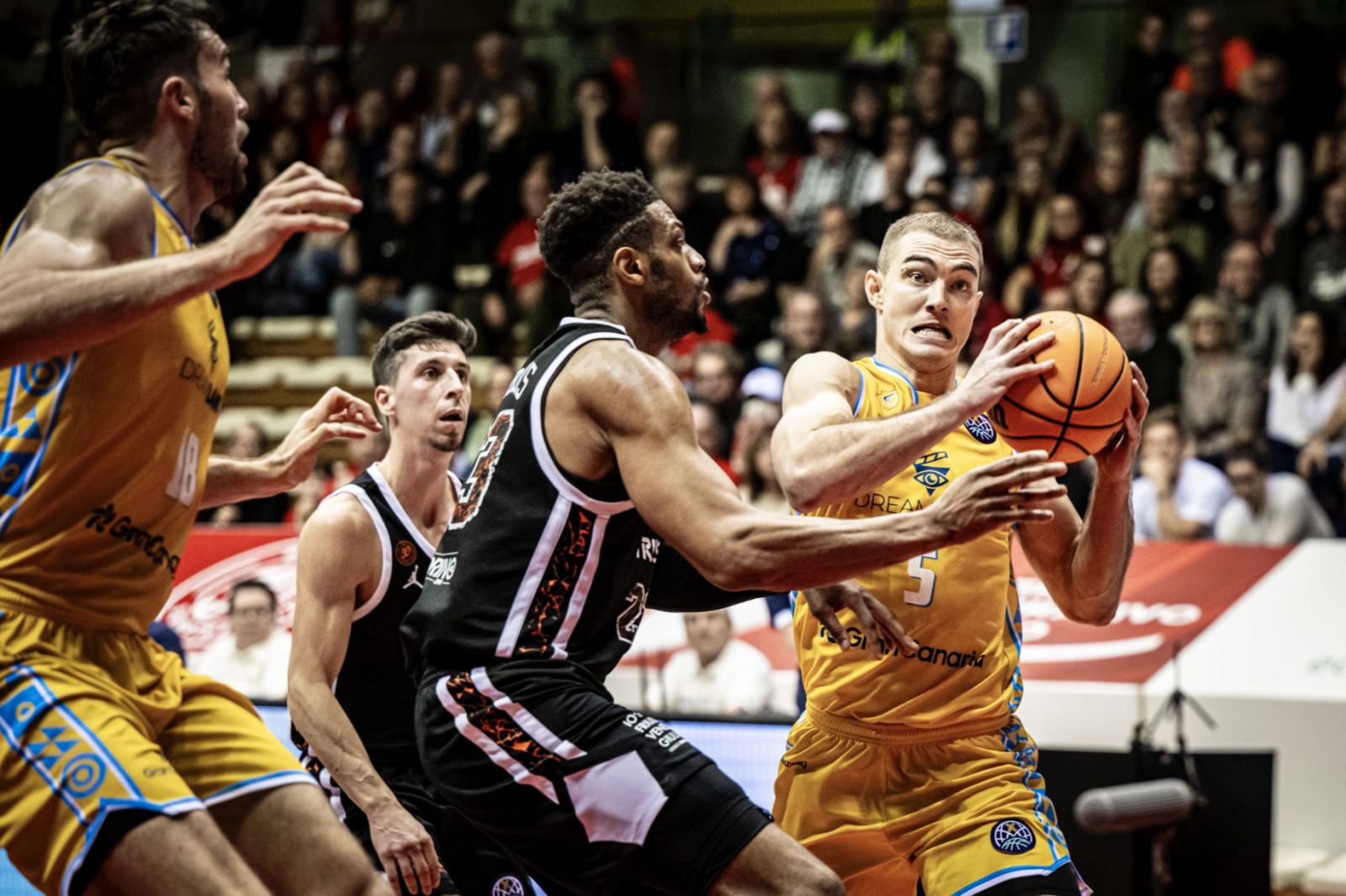 È subito mini-break spagnolo dopo poco più di un minuto di secondo quarto: 5-0 e Gonzalez deve correre immediatamente a chiamare time-out, anche se la tripla di Salvo di tabella del -10 giuliano suona come il rumore di unghie sulla lavagna (19-29). Il tentativo di rimonta successivo arriva dalle solite mani di Brown, ben assistito da Uthoff e dal 2+1 successivo di Sissoko (27-33), Gran Canaria però gioca a memoria in post-basso e in difesa Trieste non incide: il team di Lakovic torna in doppia cifra di vantaggio con Tobey al 17’, allungando con Brussino (31-43) e trovando sempre le soluzioni ottimali in attacco. Il team di casa è costretto a inseguire, il -12 di metà partita sul 37-49 è quanto di più lapalissiano a quanto visto nei venti minuti iniziali.