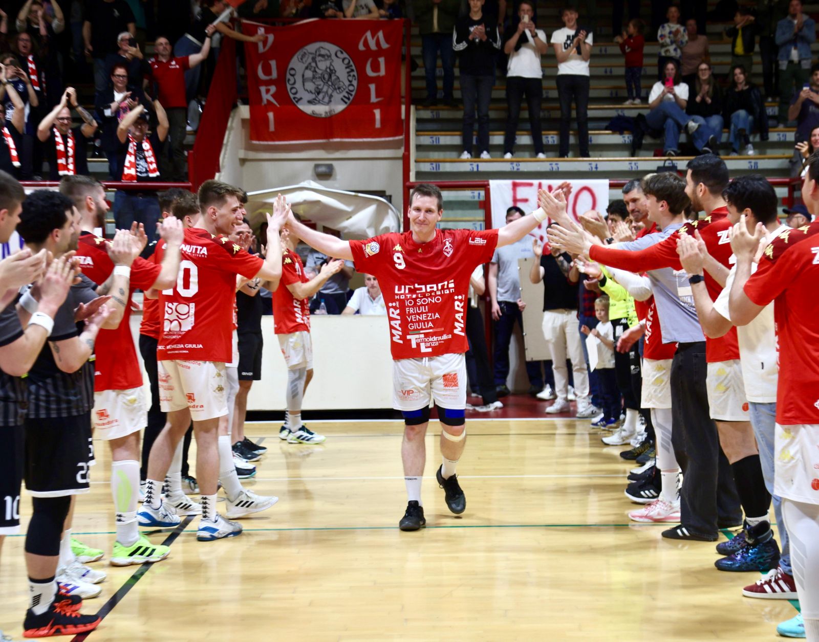 Una bella vittoria a chiudere una stagione brillante, ma anche un risultato pieno per festeggiare l’ultima da giocatore e capitano biancorosso di Alex Pernic, sommerso di applausi e di abbracci al termine di una carriera fatta da 25 anni di maglia giuliana. La Pallamano Trieste 1970 regala al proprio pubblico la “W” conclusiva di fine stagione, battendo per 27-23 il Macagi Cingoli che vale il settimo posto conclusivo in A Gold.