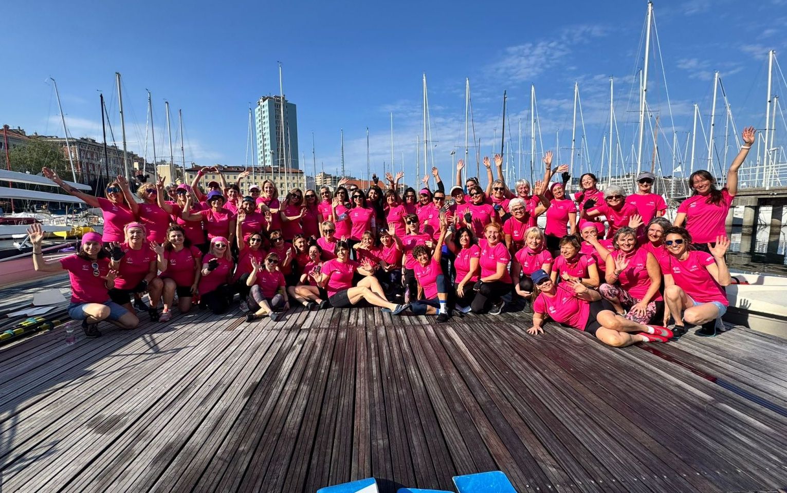 Le magliette rosa dell’evento hanno ancora una volta centrato l’obiettivo: attirare l’attenzione non solo degli appassionati di canottaggio, ma anche dei numerosi turisti presenti lungo le rive triestine.
