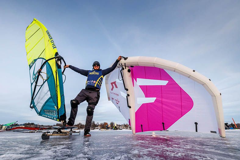 «Sono discipline diffuse nelle zone più fredde dell'Europa e del Nord America. Il windsurf su ghiaccio si pratica con una speciale tavola dotata di lame in acciaio, chiamata sled, su cui viene montata una vela tradizionale. Nel wing su ghiaccio, invece, impugni direttamente la vela e ai piedi hai pattini o sci. Ma non sono pattini normali: sono molto più lunghi e alti. Grazie al ridottissimo attrito tra lame e ghiaccio si può arrivare fino a tre volte la velocità del vento. In mare normalmente arrivi al doppio. Ed è lì che capisci che non è solo tecnica: è testa. Quando i pattini iniziano a tremare e sai che potresti cazzare la vela per andare ancora più forte, devi decidere. O molli potenza per sentirti sicuro, oppure accetti la velocità».
