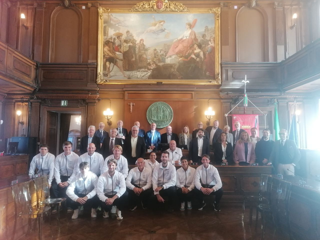 E' stato conferito questa mattina, nella sala del Consiglio comunale, il sigillo trecentesco della città di Trieste al Tennis Club Triestino. Alla cerimonia sono intervenuti il presidente del Consiglio comunale Francesco Di Paola Panteca, l'assessore alle Politiche dello Sport Elisa Lodi, il sindaco Roberto Dipiazza e, in rappresentanza del mondo dello sport, il presidente regionale Fitp (Federazione Italiana Tennis e Padel) Antonio De Benedittis, il presidente del Coni Fvg Andrea Marcon e il presidente del Tennis Club Triestino Bruno Zvech.
