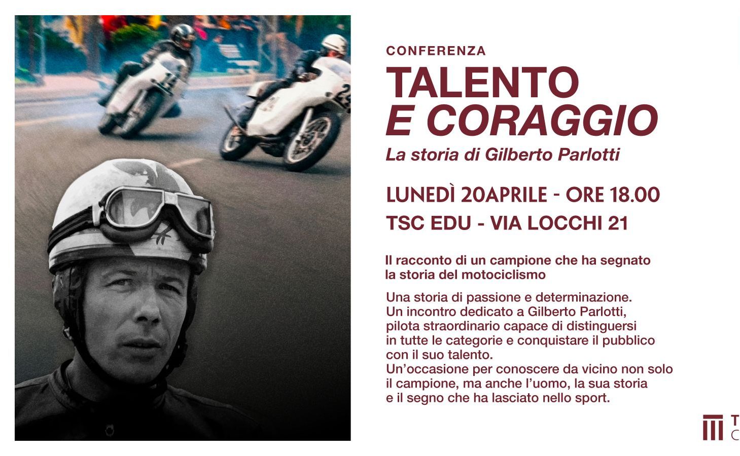 Lunedì 20 aprile, alle ore 18, a TSC EDU (via Locchi 21), si terrà la conferenza “Talento e coraggio. La storia di Gilberto Parlotti”, dedicata alla grande storia del pilota e inserita nel ciclo di conferenze sprint dedicate alla cultura sportiva. Un appuntamento che ripercorrerà la carriera di uno dei protagonisti più affascinanti del motociclismo italiano, tra talento, coraggio e passione, offrendo anche uno sguardo sull’uomo oltre il campione e sul segno lasciato nel mondo delle due ruote.
